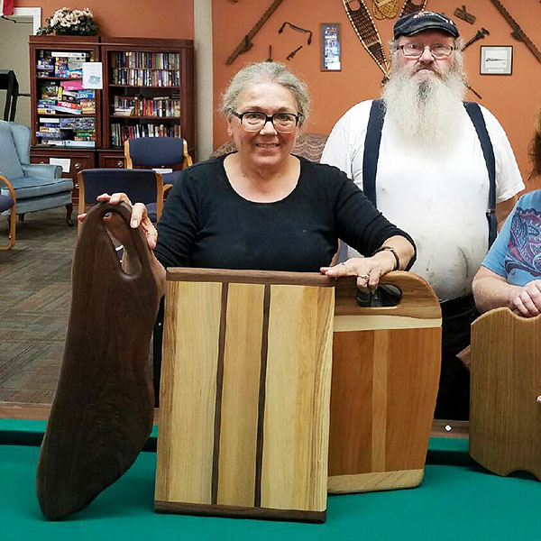 But hand-carved birds are only the tip of the iceberg. Since entering retirement, Linda has taken many classes at the senior center. Since her first class in January 2015, Linda has woven numerous baskets, carved wooden serving spoons, built a jewelry box, designed gorgeous wood inlay serving trays and cutting boards and painted numerous artworks on canvas.