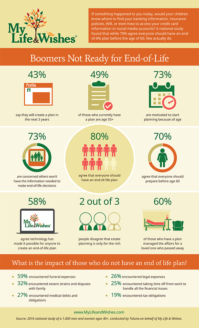 At My Life & Wishes, end-of-life planning means everything a loved one must address or untangle after a loved one has passed. So when contemplating your end-of-life plan, consider more than just your burial or funeral wishes. Complete your comprehensive plan with a secure My Life & Wishes account today!